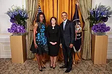 During the local elections of 2013 and early general elections of 2014, she successfully coordinated and mobilized mechanisms of justice and the Central Election Commission for a fair, democratic and transparent electoral process, following Kosovo's rigged general elections in 2010 that drew much concern about the legitimacy of Kosovo's institutions and criticism from international organizations.[20] Due to the efforts led by Jahjaga to ensure a democratic process, according to international monitors, the elections of 2013 and 2014 were fair and inclusive, drawing to the ballot boxes for the first time the citizens of Serb municipalities in the north of the country.[21] Following the June elections of 2014, Kosovo was paralyzed by a political and constitutional deadlock which prevented the formation of institutions and undermined the country's democratic functioning.[22] In an effort to find a solution to the political impasse, President Jahjaga began intensive meetings with leaders of parliamentary political parties in finding the formula for the establishment of the new Parliament and formation of the Government.[23] Jahjaga played a crucial role in resolving the crisis, ensuring democratic functioning of institutions through a credible, transparent and inclusive process, in full respect of the constitutional court decisions and legal procedures. U.S. President Barack Obama, on the occasion of Kosovo's Independence Day, congratulated Jahjaga for her "leadership and resolve in working with party leaders during the extended government-formation process."[24]