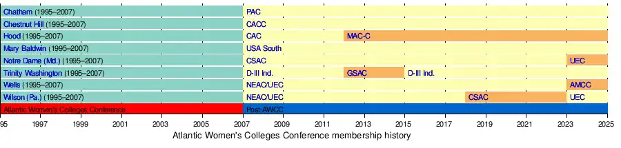 The Atlantic Women's Colleges Conference was an eight-member college athletics conference founded in 1995 and given official status in 1999. It competed in NCAA Division III and as its name implies, only offered championships in women's sports. In the conference's later years, several of its members finally became co-educational. Following the 2006–07 season these members, seeking homes for their newly created men's athletic programs departed for other conferences. Other members also switched affiliations, leaving the conference without enough members to be officially sanctioned. Following the 2007 spring season, the conference ceased operations.