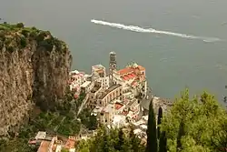 Atrani, Coast of Amalfi is a lithograph print by the Dutch artist M. C. Escher, first printed in August 1931. Atrani is a small town and commune on the Amalfi Coast in the province of Salerno in the Campania region of south-western Italy. Atrani is the second smallest town in Italy and was built right at the edge of the sea. This image of Atrani recurs several times in Escher's work, most notably in his series of Metamorphosis prints: Metamorphosis I, II and III.