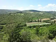 The soils of the commune are formed on a substrate which is mainly limestone: this limestone is also used to roof the housing.[6] The village is however located on a hill of red marl of the Oligocene period and has yielded bones of large mammals and reptiles (crocodile and turtle). In the Aiguebelle valley (a stream that never runs dry even in the most severe droughts) fossils of plants and fish (Smerdi macrurus) have also been found. The areas of both deposits are classified as geological reserves (included in the Natural Geological Reserve of Luberon) and collecting of fossils is prohibited. Information panels are placed close by. A selection of fossils from there can be seen at the Vachères Museum,[7] at the Natural Regional Park of Luberon Maison du Parc[8] in Apt (Vaucluse), and the National Museum of Natural History in Paris (Jardin des Plantes).