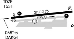 • Runway 7/25: 3,700 x 75 ft (1,128 x 23 m) plus 240 ft (73 m) overruns at each end, surface: asphalt