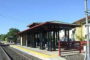 Auburn station is an Amtrak station in Auburn, California. Located at the corner of Nevada Street and Fulweiler Street, it serves as the northern terminus of the Capitol Corridor line. The station is not staffed. The platform is next to a short spur track off Track 2 of Union Pacific Railroad's route over Donner Pass.[1] Because of the geography of the city, the Union Pacific's mainline tracks are split, with Track 1 running through the eastern side of the city and Track 2 crossing the western side of the city.[6] The California Zephyr bypasses the city on its route between Roseville and Colfax primarily via Track 1. Auburn became a stop on Amtrak's Capitol Corridor in January 1998.[6]
