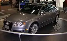 The Audi B7 platform Audi S4 quattro, based on the Audi B7 A4, debuted in late 2004. Although Audi classifies it as a new car, the differences between it and the outgoing B6 S4 casually appear to be primarily cosmetic, and is still classified by the internal designation: Typ 8E (although with revised sub-designations - saloon: 8EC, Avant: 8ED, and Cabriolet: 8HE).[1] It has the same 4.2-litre V8 engine (identification code: BBK) as the B6 S4, producing a power output of 253 kW (344 PS; 339 bhp) at 7,000 rpm, and 410 N⋅m (302 lbf⋅ft) torque at 3,500 rpm.