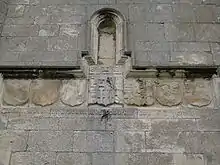 All Saints Church, Aughton is located at the far end of the village and overlooks vast expanses of the floodplains of the River Derwent. Tucked away in the village, it can only be accessed on foot through a small gate and field adjacent to Aughton Hall. An historic church, famous for its association with Robert Aske, leader of the insurgents in the Pilgrimage of Grace, October 1536. Aske was executed for treason on 12 July 1537.[3] The church displays a mixture of architectural designs as it has been altered throughout the years, but is noted especially for its Norman arch between the chancel and nave. On the chancel floor a well-preserved ancient brass of a knight in 15th century plate armour and his lady can be found, although much of the lady is now missing. Standing in the churchyard and looking up at the tower, (which was rebuilt by Christopher Aske sometime after 1536), a shield with six quarterings can be seen engraved on the outside wall, now badly weathered but it offers the following inscription in old French text: "Christofer le second filz de Robert Ask chr oblier ne doy, Ao Di 1536." This is literally translated as: "Christopher, the second son of Robert Aske, chevalier, ought not to forget the year of our Lord 1536." Also on the tower is a benchmark of the time and carved, in sunk relief, a newt or salamander otherwise known in Old English as an Ask.