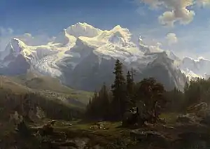 In 1844 and 1847, together with August Leu and Georg Saal, he visited Norway; painting a series of fjordscapes.[2] In 1854, he stayed in London for several weeks to study the museums. His brother, Ernst, had been serving there as a librarian and Royal Tutor since 1851. A meeting was arranged with Prince Albert, who purchased Becker's painting "The Jungfrau", as a gift for Queen Victoria. In the years to come, she acquired more paintings and, in 1864, invited him to visit Scotland. In 1869, he paid a brief visit to her estate, Osborne House, on the Isle of Wight.