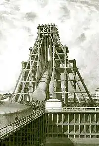 Montferrand selected the quarry contractor in March 1830, in a bidding war that reduced the column price from 420 thousand to 150 thousand roubles.[11] Carving took a year and a half, and in September 1831 the column safely separated from the rock. By April 1832, the carvers completed shaping it and started blasting the path from the quarry to the loading bay. The barge loading nearly ended in a catastrophe. The column broke through the ramp and threatened to roll over the barge; a team of 300 workers managed to set it back in place.[12]