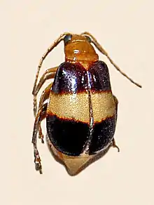 Aulacophora dorsalis can reach a length of about 6–8 millimetres (0.24–0.31 in). The basic color of these beetles is yellowish, with two black transversal bars at the top and bottom of the elytra.