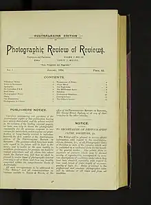 The magazine was first published in 1894 as the Australian edition of the British Photographic Review of Reviews, after the photographic supply company Baker & Rouse purchased the Australasian publishing rights.[2] At this early stage of its publication, the magazine was issued as a short ten to fifteen page supplement to the British edition.[3] In 1895 the magazine's name was changed to Australalasian Photographic Review, and in 1903, the title was shortened to Australasian Photo-Review.[4]