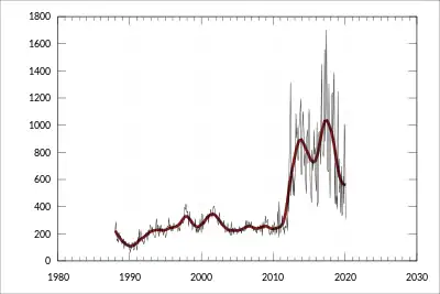 Some 90,000 Australians are resident in Hong Kong.[9] According to the 2016 Census, 86 886 people of Hong Kong origin live in Australia, with 280 943 Cantonese speakers in Australia, the largest number after Mandarin Chinese and Arabic.[10] The majority Hong Kong immigrants live in Sydney and Melbourne.[11]