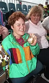Tracy Lee Barrell holding Barcelona 1992 Paralympic medal