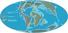 Alarcón-Muñoz et al. (2023) suggested that austrokritosaurs shared an ancestor with the North American kritosaurins in the Santonian, about 85 million years ago, before dispersing into South America. This likely occurred via island chains and rafting. The South American hadrosauroid Gonkoken appears to have diverged from North American hadrosauroids at an even earlier time, about 91 million years ago in the Turonian.[1] The Argentinian nodosaurid Patagopelta and North American titanosaur Alamosaurus likely experienced similar dispersal events from relatives in North and South America in the late Campanian–early Maastrichtian.[4][5]