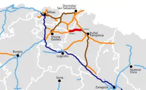 The Autovía A-10 (also known as Sakanako Autobia) is an autovía in Navarre.[1] It is 29 kilometres (18 mi) long and runs from the Autovía A-15 at Irurtzun to the Autovía A-1 at Altsasu. Built between 1992 and 1995 as an upgrade of the N-240 road, it received the A-10 designation in 2003 as part of the general renumbering of Spanish autovías.[2]