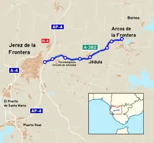 The Autovía A-382 is a local autovía in Andalusia, Spain. It is 27 km (16.8 miles) long and runs from the Autopista AP-4 at Jerez de la Frontera to Arcos de la Frontera. It was originally part of the N-342 road.