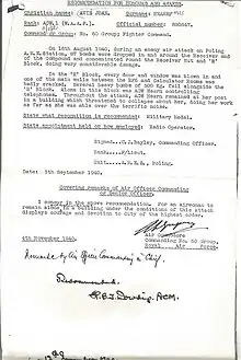 - ↑ "Recommendation for honours or awards" (Document). RAF. September 1940.