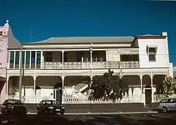 The building has two rendered masonry chimney stacks, and the rear of the structure has a first floor verandah which has been enclosed with fibrous cement sheeting and casement and glass louvre windows. Two timber framed stairs access the first floor flats, and the rear wall of the building consists of painted brickwork and quoining at the southern end and rendered brickwork at the northern end. The ground floor has a lean-to addition at the northern end with fibrous cement wall sheeting and a corrugated iron skillion roof. The southeast ground floor verandah space has been enclosed to form a laundry area.[1]