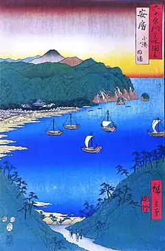 Hiroshige ukiyo-e, showing a harbor of Awa Province, specifically the then village of Kominato