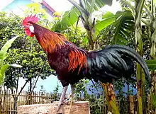 Ayam Ketawa, or "laughing chicken", is a breed of chicken originating from the area of Sidenreng Rappang in South Sulawesi, Indonesia. It is one of several breeds of long-crowing chicken prized for the clarity and unusual length of their crows. The crow of Ayam Ketawa cocks has an unusual similarity to a human laugh. The breed was originally held as a status symbol of the Buginese royal family, but has entered into higher popularity in recent times since the fall of the monarchy.[1] Today it is still seen as a symbol of courage, social status and heroism[2][3] and they compete in contests for the most perfect crow, for the Governor of Sulawesi Cup.[4]