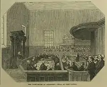 The murderer, John Tawell, who was arrested after police sent a telegraph message to Paddington Station, was tried in the courtroom and then executed in the Market Square in 1845.[2] An extension to the rear to accommodate the judge's lodgings was built to the designs of Edward Buckton Lamb and completed in 1850, while an extension to the south west, this time to accommodate the county constabulary headquarters, was built to the designs of David Brandon in a similar style to the main building and completed in 1865.[1]