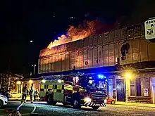 Crews from the Scottish Fire and Rescue Service continued to fight the fire into the early hours of Tuesday morning. By 6:30am on Tuesday morning, the emergency operation had been reduced to three pumps and two high-reach vehicles. Fire crews with an aerial appliance travelled more than 35 miles (56 km) from Castlemilk in Glasgow to assist local firefighters in their response to the continued efforts to extinguish the fire.[17] Rail services continued to be cancelled on Tuesday, with a number of roads in the area surrounding the building being closed, causing significant disruption and delay in Ayr town centre.[18] Rail operator ScotRail announced that they were not expecting to be able to run services to or from Ayr station for "at least the next few days".[19]