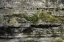 The source is covered by limestone and marl of the Kimmeridgian age, which form a small cuesta visible to the southeast of the village of Bèze, under the compact limestone of the Portland Group. The ceiling of the cave is covered with kaolinite while the walls are covered with manganese oxide in some places.[10] The set of galleries has a slight but steady incline towards the south, where it is covered by patches of Cretaceous rocks and then by the Tertiary sediments of La Bresse.[9] The karst in the region must have been established either at the end of the Oligocene, or during the Miocene.[11]