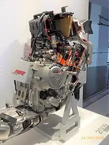 In 2015, the S1000RR saw major updates and changes. Notably, the bike now weighed 4 kg (8.8 lb) less and gained 4.4 kW (5.9 hp; 6.0 PS) to a claimed output of 148 kW (198 hp; 201 PS). This was achieved through reshaping the ports, a new cam profile, lighter valves and shorter velocity stacks drawing from a larger airbox. An all-new exhaust has also been implemented, drawing from the previous years HP4, adding a controlled interference pipe and acoustic valves. More options made available in the 2015 variant were included in the "Dynamic Package" which included BMW's Quickshift Assist Pro, allowing for clutchless up and downshifts. BMW also introduced a "Race Package" which gave the user DDC from the HP4, a "Pro" riding mode as well as launch control, a customizable pit limiter and cruise control. To the electronics, BMW again added smoother front wheel lift intervention and a new "User" mode, where the rider is able to customize some defined parameters, allowing for a fully personalized riding experience. More learnings from the HP4 include combined braking (automatically activating the rear brake when the front brake is applied), on-the-fly ABS and DTC control and lean angle sensors that provide a readout on the dash.[14] The 2015 bikes lighter chassis consists of four individual aluminium cast pieces welded together with the engine tilted forward at a 32 degree angle and integrated as a load-bearing element. The fork overlap of the immersion tubes was reduced to 6 mm (0.2 in) and the steering head angle increased 0.5 degrees to 66.5 without any change in the yoke offset. The swingarm pivot point was lowered by 3 mm (0.1 in) and the wheelbase lengthened by 15 mm (0.6 in). The new chassis geometry provides increased rider feedback from the front end the rear wheel.[15] The visual updates to the S1000RR were also vast, with the asymmetric headlights being swapped (high beam left, low beam right), a softer nose and all new colorways. The muffler was changed to a larger can, while the fairings became more aerodynamically advanced adding vents and slips to allow for better stability at high speed.[15]