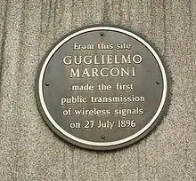 A plaque on the outside of the building marks this as the location from which Guglielmo Marconi made the first public transmission of wireless signals, in 1897 while it was the Central Telegraph Office building of the General Post Office complex.[7] The Telegraph Office building was originally built in 1874. It was damaged by a German bomb in 1917,[3] and more severely damaged by bombing in 1940[8] when the interior was burned out; it reopened in 1943. By the 1950s, the volume of telegraph traffic had declined; the Telegraph Office closed in 1963,[3] Subsequently, the building was declared unsafe and was demolished in 1967.[9] Following archaeological investigations by the Museum of London, planning permission was granted for the new building in 1979.[3]