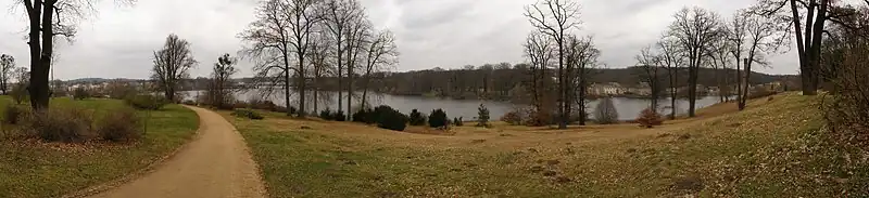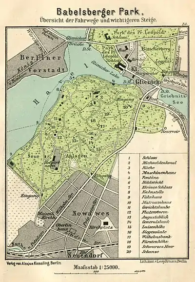 Babelsberg Park (German: Park Babelsberg) is a 114 hectare park in the northeast of the city of Potsdam, bordering on the Tiefen See lake on the River Havel. The park was first designed by the landscape artist Peter Joseph Lenné and, after him, by Prince Hermann von Pückler-Muskau and Karl Friedrich Schinkel,[1] by order of the then-prince William I and his wife, Augusta. Located on a hill sloping down to the lake, the park and castle are part of the Palaces and Parks of Potsdam and Berlin, which were inscribed on the UNESCO World Heritage List because of their unique architecture and testimony to the development of landscape design.[2]