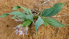 Plants range from 70 - 200 mm tall. Leaves are oblong to lanceolate, with a slight twist in distally. Leaf blades are suberect and 10-18mm long. Plants can host from three to seven flowers. Flowers range in colour from a pale grey-green to greyish lilac. Petals host purple streaks. Flowers are zygomorphic and possess a sweet spicy scent.[2]