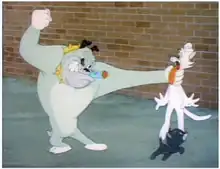 Eventually, the bulldog frightens the kitten into giving up the whistle, and (after a couple of false starts) he gains the upper hand on the black cat by luring him under a large paintbrush, turning him white and rendering his bad luck powers useless. However, the white kitten saves the day by painting himself black and crossing the bulldog's path. The bulldog is conked by a falling anvil, and ends up swallowing the whistle by accident, triggering a case of the hiccups, each one of which causes the whistle to go off. As a result, all manner of huge objects plummet from the sky (ranging from a kitchen sink all the way to a battleship), causing the bulldog to flee in terror. The cartoon ends with the formerly-black cat giving the kitten his bowler hat as a sign of gratitude and for saving his life.[5] The kitten snickers in delight when he realizes his new purpose in life as a bad luck cat.