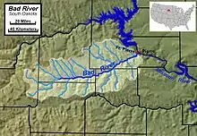 The Bad River (Lakota: wakpá-šiča;[1] "river-bad") is a tributary of the Missouri River, approximately 161 miles (259 km) long,[2] in central South Dakota in the United States. The river is formed at Philip, South Dakota, by the confluence of its North and South forks. The North Fork Bad River rises in eastern Pennington County and flows 51 miles (82 km)[2] east-southeast to Philip, while the South Fork Bad River rises at the confluence of Whitewater Creek and Big Buffalo Creek in Jackson County, within the Buffalo Gap National Grassland, and flows 36 miles (58 km) northeast to Philip.[2] The main stem of the Bad River flows east-northeast from Philip, passing Midland and Capa. It joins the Missouri at Fort Pierre. The Bad drainage basin is about 3,000 square miles (7,800 km2) and is located south of the Cheyenne River in the Pierre Hills and Southern Plateaus.[3]