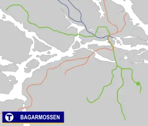 Bagarmossen metro station is on the green line of the Stockholm metro, located in Bagarmossen, Söderort in the south of Stockholm. The surface station was opened on 18 November 1958 as the southern terminus of the extension from Hammarbyhöjden. On 15 August 1994, the line was extended further to Skarpnäck.[2]