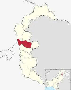 The Bagh District is bounded on the north by the Muzaffarabad District, the Hattian Bala District, and the Baramulla District of Indian-administered Jammu and Kashmir, on the east by the Haveli District, on the south by the Poonch District, and on the west by the Rawalpindi District of Pakistan's Punjab Province. The total area of the district is 770 square kilometers.[5] The Bagh District is linked to the Muzaffarabad District by two roads, one via Sudhan Gali (80 km) and the other via Kohala (97 km). The district headquarters is the city of Bagh, which is situated 46 km from Rawalakot. It is said that a bagh (garden) was set up by a landowner where the premises of the Forest Department are now located. As a result, the area that is now the district headquarters was named "Bagh".[6][7]