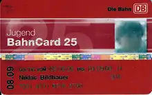 BahnCard (German Bahn – Rail) is a discount subscription programme offered by Deutsche Bahn (DB), the German national railway company. Unlike airline loyalty programs, but similarly to the UK Railcard, the BahnCard entitles the passenger to a discount price and must be purchased prior to travel. The BahnCard is offered in a non-business and a business version called BahnCard Business. Non-business BahnCard contracts are automatically renewed each year, unless they are cancelled with sufficient notice. Three variants of BahnCard are sold by Deutsche Bahn: The BahnCard 25, the BahnCard 50, and the BahnCard 100. The first two variants allow passengers to get 25% and 50% discount respectively on standard long-distance rail fares, while the Mobility BahnCard 100 is a type of annual ticket that allows free unlimited travel on most of the German railway network for a fixed price.[1] The (non-business) BahnCard 25/50 are valid for one year and can only be purchased by subscription. If they are not canceled no later than six weeks before the expiry date, their term is automatically extended by another year.[1] BahnCard Business 25/50 are also valid for one year but require no cancellation.[2] Unlike the personal BahnCard, BahnCard Business can be combined with the discount that is granted to large-volume business customers.[3][2]