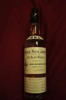 The Bailie Nicol Jarvie was first blended by Nicol Anderson & Co, a Glasgow-based whisky company that was acquired by the whisky company Macdonald & Muir of Leith in 1921. The whisky was named after a character in Sir Walter Scott's renowned novel Rob Roy a bailie (magistrate) who tackled a sword-wielding Highland clansman in an inn at Clachan of Aberfoyle,[1] setting fire to his kilt with a red-hot poker.[2] The blend was particularly popular in the early 20th century.