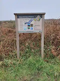 Bakers Pit is a 45 ha nature reserve managed by the Cornwall Wildlife Trust, on moorland known as Noon Diggery, on the eastern edge of the granite uplands of West Penwith. The nearest village is Nancledra and the reserve is approximately mid-way between the towns of Penzance and St Ives. On the southern boundary is the Castle-an Dinas quarry, and Roger's Tower, a folly built on an Iron Age hillfort.[1] The granite is fine grained and is quarried and used mostly as aggregate; in its kaolinised state it was mined at Baker's Pit. The reserve is on a plateau and slopes gently to the south-east with little shelter from the south-westerly prevailing winds.[2]