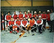 In the mid-1970s, three local young men - Lane Lemon, Paul J Scott, and Lloyd Mitchell - formed the Balaclava Burners. This team drew others from the communities of Leith, Annan, and even Owen Sound. Since the nearest year-round ice surface was in Owen Sound, practices and games were often held there, although the team also played in Keady, Chatsworth, Kilsyth, and Wiarton. Members of the team in 1987 included (from bottom left) Gary Tottenham, Joe O'Reilly, Ken Morrison, Pat Moore, and Steve Hiscox; and (from top left) Jeff Morrison (Equipment Manager), Paul J Scott, Lane Lemon, Craig Stephens, Scott Davis, Ted Van Balkom, Paul Smith, Tim Hughes, Bev Davidson, Jim Edmonstone, and Jeff Harron (managing due to suspension).