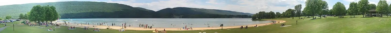 Panoramic view of the beach at Bald Eagle State Park, with Foster Joseph Sayers Reservoir and Bald Eagle Mountain