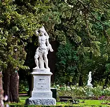 The gardens feature a large modern conservatory, returned Ex-POW war memorial, and the heritage statuary pavilion. The Stoddart Statue collection consists of 12 white marble figures from Italy donated by Thomas Stoddart in 1884. The 12 statues were figures from classical mythology: Spring, Summer, Autumn, Winter, Hercules, Pomona, Bacchante, Hebe, Flora Farnese, Leda, Mercury and Flora.[3] They were badly damaged by vandals in 2002 and were placed in the statuary pavilion after repair. The statues were returned to their original 1884 pedestals in March 2010.[4]