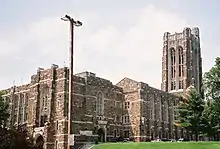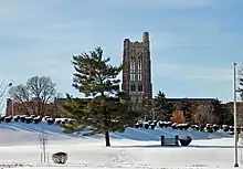 The school is situated on a 38 acres (0.15 km2) hill-top campus located in the Coldstream-Homestead-Montebello neighborhood in Northeast Baltimore.[9] The main campus building, a designated National Historic Landmark, is constructed of granite and limestone in a Collegiate Gothic architectural style and features a 200-foot-tall Gothic tower.[10][11]