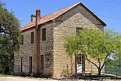 Bandera County was organized in 1856 and used makeshift quarters for jail and courthouse functions until 1877, when the county purchased a two-story stone building constructed in 1868 which is now known as the Old Courthouse. The building served as county courthouse until the present courthouse was built in 1891.[2][3] A former one-story cut stone jail adjacent to the Old Courthouse designed by San Antonio architect Alfred Giles was built in 1881.[4] On October 31, 1979, the two buildings, located on 12th St. between Maple St. and SH 16, were added to the National Register of Historic Places as a single entry.[5] The two buildings are also jointly listed as a State Antiquities Landmark.[6]