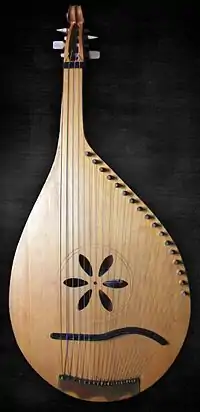 Musicians who play the bandura are referred to as bandurists. In the 19th and early 20th centuries traditional bandura players, often blind, were called kobzars.[3] It is suggested that the instrument developed as a hybrid of gusli (Eastern-European psaltery) and kobza (Eastern-European lute). Some also consider the kobza as a type or an instrument resembling the bandura.[4] The term bandura occurs in Polish chronicles from 1441. The hybridization, however, occurred in the late-18th or early-19th centuries.