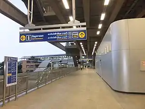 Bang Wa station (Thai: สถานีบางหว้า, pronounced [sā.tʰǎː.nīː bāːŋ wâː]) is a rapid transit station on the BTS Silom Line and MRT Blue Line in Pak Khlong Phasi Charoen Subdistrict, Phasi Charoen District, Bangkok, Thailand. The station is on the Phet Kasem Interchange where Ratchaphruek cuts with Phet Kasem Roads. The station serves as an interchange station for BTS Silom Line and MRT Blue Line, providing direct interchange, but with separate fare and ticket systems for the two lines.[1][2][3] Out of the interchanges between the MRT and Skytrain, Bang Wa was the only station where both systems share the same name for the station, as the other interchange stations on the BTS Skytrain (Asok, Sala Daeng, Mo Chit, and Ha Yaek Lat Phrao) all have separate names with their MRT counterparts (Sukhumvit, Si Lom, Chatuchak Park, and Phahon Yothin stations). This is no longer true after the opening of the MRT Yellow Line's station at Samrong.
