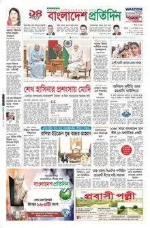 Bangladesh Pratidin, literally meaning Bangladesh Everyday, is a daily, Bengali-language independent[3] newspaper in Bangladesh.[4][5] It was founded on 15 March 2010.[2] Bangladesh Pratidin tops the list of highest circulated dailies in the country out of 345 newspapers published from Dhaka and elsewhere, the information minister told parliament 10 March 2014.[4] Naem Nizam is the editor of Bangladesh Pratidin.[6] Bangladesh Pratidin is a subsidiary of East West Media Group, which is owned by Bashundhara Group. On behalf of East West Media Group, the publisher of the newspaper is Moynal Hossain Chowdhury.
