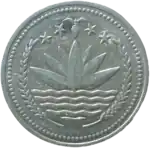 In the case of the fifty paise coin, three types of designs can be seen from the first circulation of this coin in 1973 until 2001.[5][6] Each of the three types of designs had the national symbol of Bangladesh on the obverse. At the center of the National Emblem is a lotus flower floating in water, surrounded by two grains of rice. Three intertwined jute leaves at top and four stars in total, two each on either side of leaf. The four asterisks represent the four principles of the Bangladesh constitution (nationalism, secularism, socialism and democracy).