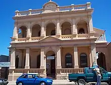 Charters Towers was at its economic peak in the late 19th century. According to Government Geologist Robert Logan Jack, Charters Towers was the third largest gold producing area in Australia, after Ballarat and Sandhurst (Bendigo).[28] Many new buildings were completed in this period in Charters Towers. The "T" junction of Mosman and Gill Streets became the financial district of Charters Towers. For one block to the east, north, and south were eight banks, the post and telegraph office, two assaying offices, and four solicitor's offices. Share-brokers occupied the Royal Arcade, and other offices were located in Mosman and Bow Streets. The Royal Arcade was built in 1888 for Alexander Malcolm and by 1890 the Stock Exchange operated from the building. Other significant buildings of this era include the 1887-92 Masonic Lodge and the 1892 Post Office (Commonwealth Heritage List 105523). Banks of this era include the 1881 (lowset timber) Bank of Australasia, the London Chartered Bank (which purchased the two-storey masonry building from local builder Hugh Ross in 1887), the former Australian Joint Stock Bank (later the Australian Bank of Commerce) and the Queensland National (QN) Bank, both designed by FDG Stanley and both built in 1891. The Union Bank then occupied the former QN Bank premises in Mosman Street.[29] All of these buildings remain, apart from the Bank of Australasia. The Bank of NSW was considered the first financial institution to erect premises worthy of the town and the business conducted there. The North Queensland Register claimed it was the largest banking institution in Australasia in the 1890s.[1][30]