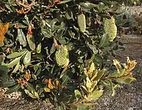 Flowering typically occurs between October and January. Unlike those of most other banksias, the cylindrical inflorescences hang down from branchlets and measure 5–11 cm (2–4 in) in length and 8–10 cm (3.1–3.9 in) in diameter. They are green-yellow in colour and smell of honey, dripping large amounts of nectar. The buds are a rich chocolate brown in colour until the yellow flowers push through. The inflorescences turn grey as they age, and the old flowers remain as up to 20 large woody follicles develop. Oval in shape, wrinkled in texture and covered with fine hair, they can reach 4.5 cm (1.8 in) long, 3 cm (1.2 in) high, and 3 cm (1.2 in) wide.[5]