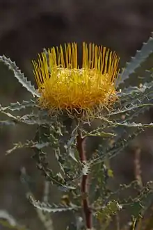 Banksia nobilis, commonly known as the golden dryandra, great dryandra or kerosene bush, is a shrub of the family Proteaceae which is endemic to Western Australia. It occurs on lateritic rises from Eneabba to Katanning in the state's Southwest Botanic Province. With large pinnatifid leaves with triangular lobes, and a golden or reddish pink inflorescence, it is a popular garden plant. It was known as Dryandra nobilis until 2007, when all Dryandra species were transferred to Banksia by Austin Mast and Kevin Thiele. There are two subspecies, B. nobilis subsp. nobilis and B. nobilis subsp. fragrans.