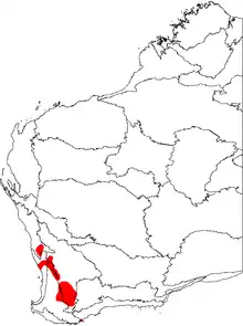 Banksia nobilis occurs on lateritic rises from Eneabba in the north to Katanning in the south. Much of its distribution roughly follows the boundary between the Jarrah Forest and Avon Wheatbelt biogeographic regions, but at its northern limits it extends into the Swan Coastal Plain and Geraldton Sandplains.[11] For most of its range it grows in eucalypt woodland and tall shrubland, but at its northern extents it grows among thick kwongan.[2]