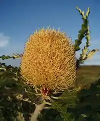 The cream to yellow flower spikes, known as inflorescences, can appear at any time of year.[3] They arise on the ends of one- or two-year-old stems and are roughly cylindrical in shape with a domed apex,[3][4] measuring 4–12 cm (1.6–4.7 in) high and 9–10 cm (3.5–3.9 in) wide at anthesis. Each is a compound flowering structure, with a large number of individual flowers arising out of a central woody axis.[3] A field study on the southern sandplains revealed an average count of 1369±79 on each spike.[6] The perianth is grey-cream in bud, maturing to a more yellow or cream. The style is cream and the tip of the pollen-presenter maroon. Ageing spikes are grey, with old flowers remaining on them, and develop up to 20 large red follicles each. Roughly oval and jutting out prominently from the spike, each follicle is 3.5–5 cm (1.4–2.0 in) long by 2–3 cm (0.8–1 in) wide and 2–3 cm (0.8–1 in) high and is covered in dense fur, red-brown initially before aging to grey. It remains closed until opened by bushfire, and contains one or two viable seeds.[3]