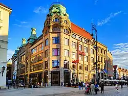 Built from 1902 to 1904 for the German Jewish merchant family Barasch by architect Georg Schneider, the store was opened on 4 October 1904. In 1929, the original art nouveau facade facing the market square was given a simpler, modernist look; the huge glazing above the main entrance was replaced with more conventional window rows. The large glass globe on the main tower at the corner of Ulica Szewska and Kurzy Targ (German: Hintermarkt), which had been damaged by lightning, was also removed.